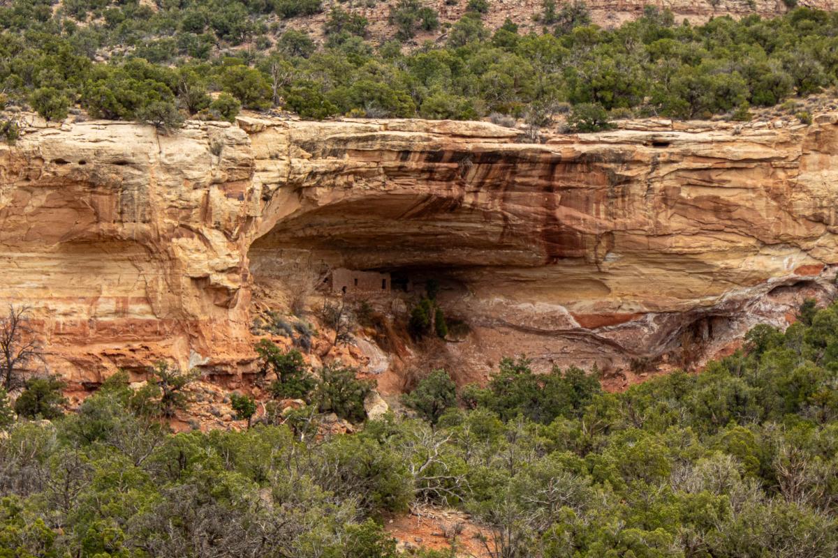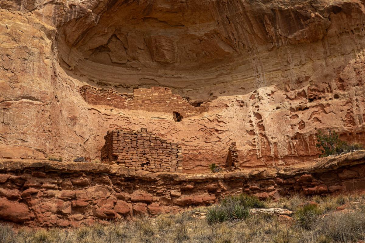 Double Cliff House was built in two ledges of the alcove. Pueblo people must have used a ladder to get to the two upper rooms. The stone masonry has been protected by the alcove and is well preserved. Archaeologists recorded and mapped Double Cliff House in 1965. They found pottery sherds and stone tools that indicated the House was probably used in the thirteenth century, AD 1200s.